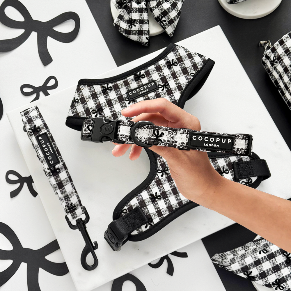 Take your pup on a stylish stroll with the Pup in Paris Collar! This black and white checked design is both chic and safe, with an adorable embroidered bow detail and a reliable safety lock. Perfect for any fashionable dog walk!