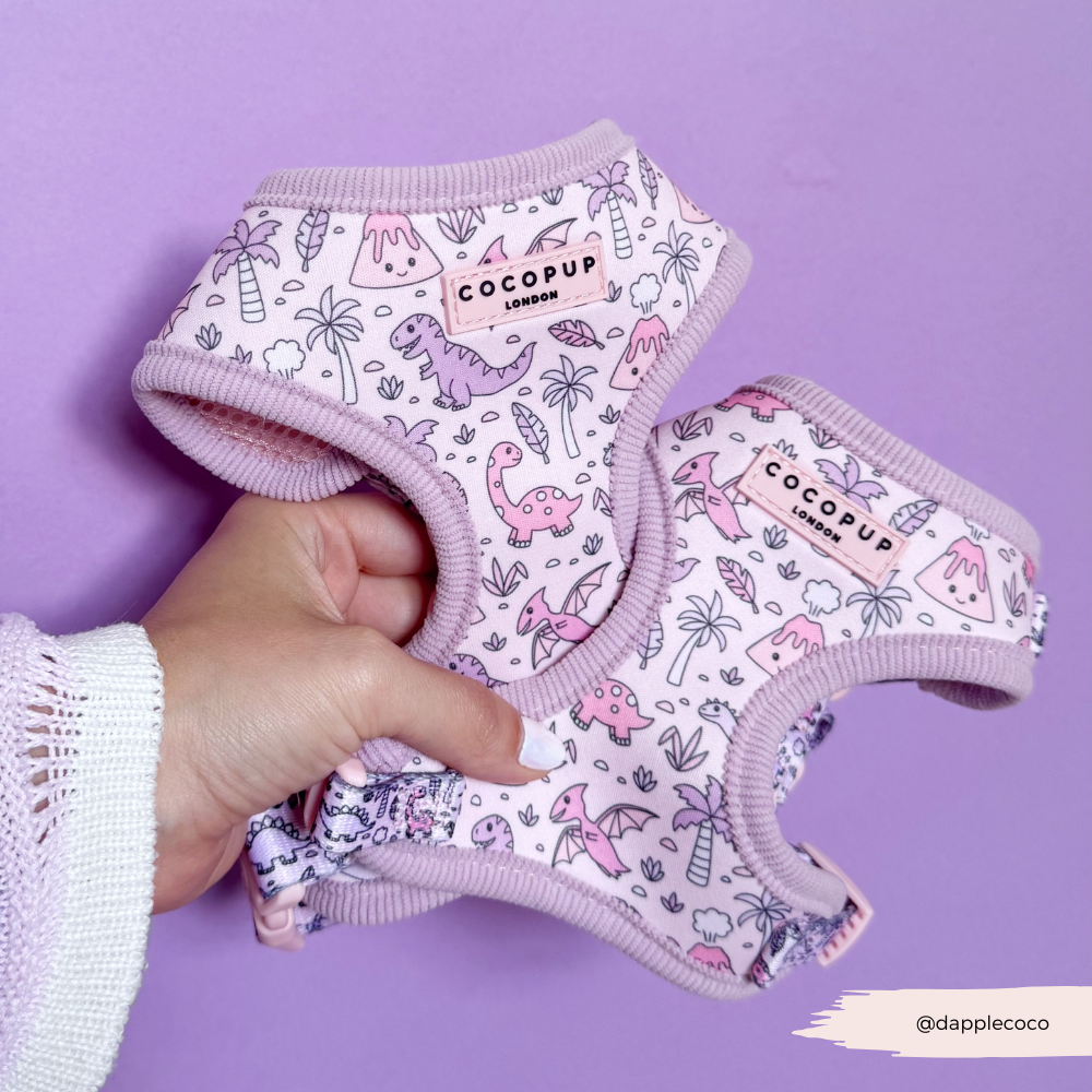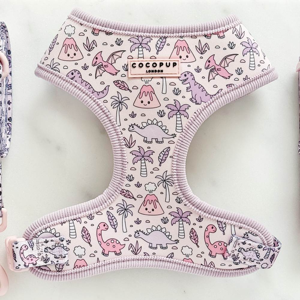Walk your dog in prehistoric style with our lilac Princess Dino Adjustable Neck Harness! Perfect for dinosaur-loving dog owners, this harness adds a dose of cuteness to every walk. With easy adjustability and a playful design, it's a must-have for any dog owner.