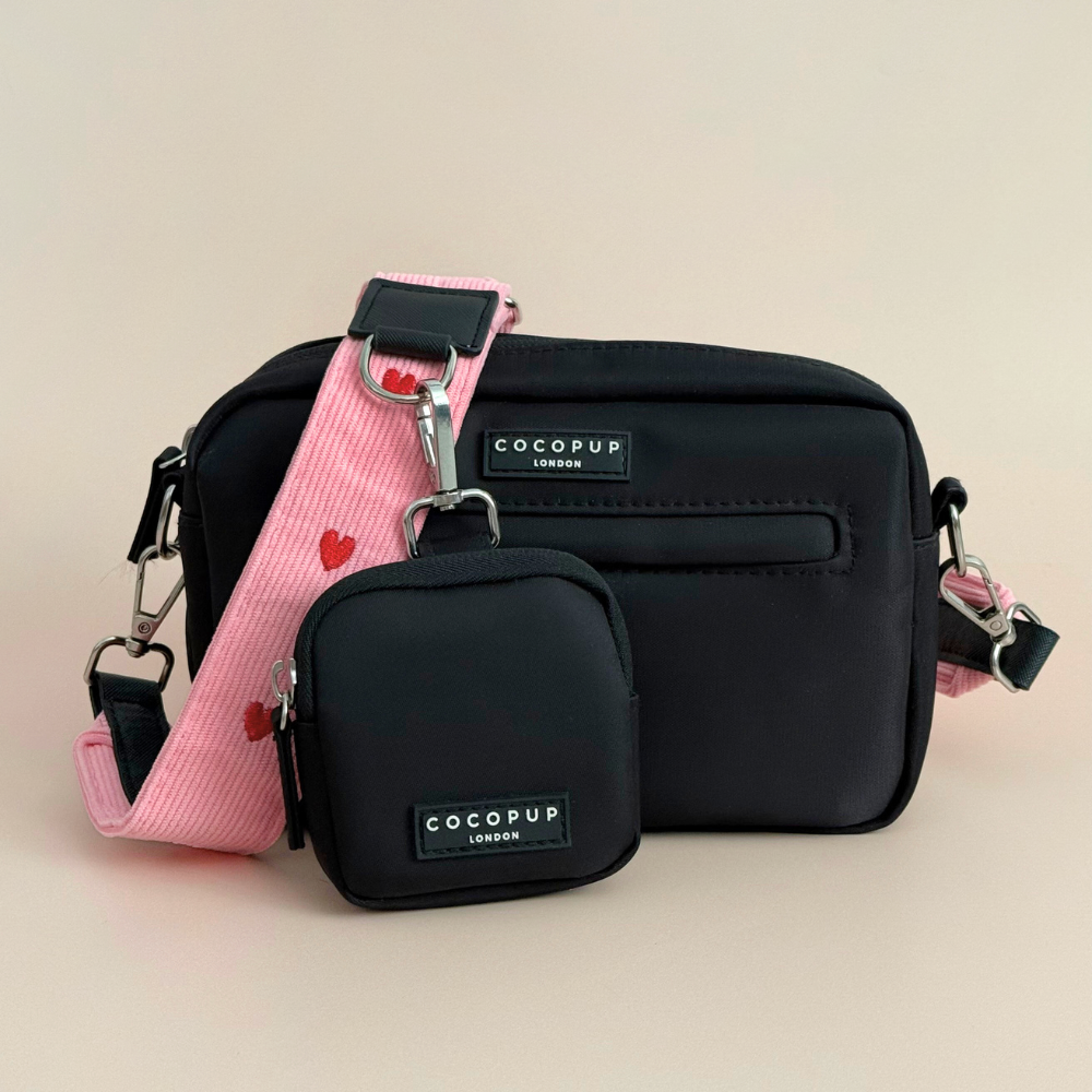 Take your dog for a walk in style with this Bundle featuring the Dog Walking Black Bag and Pink Heartstrings Cord Bag Strap.