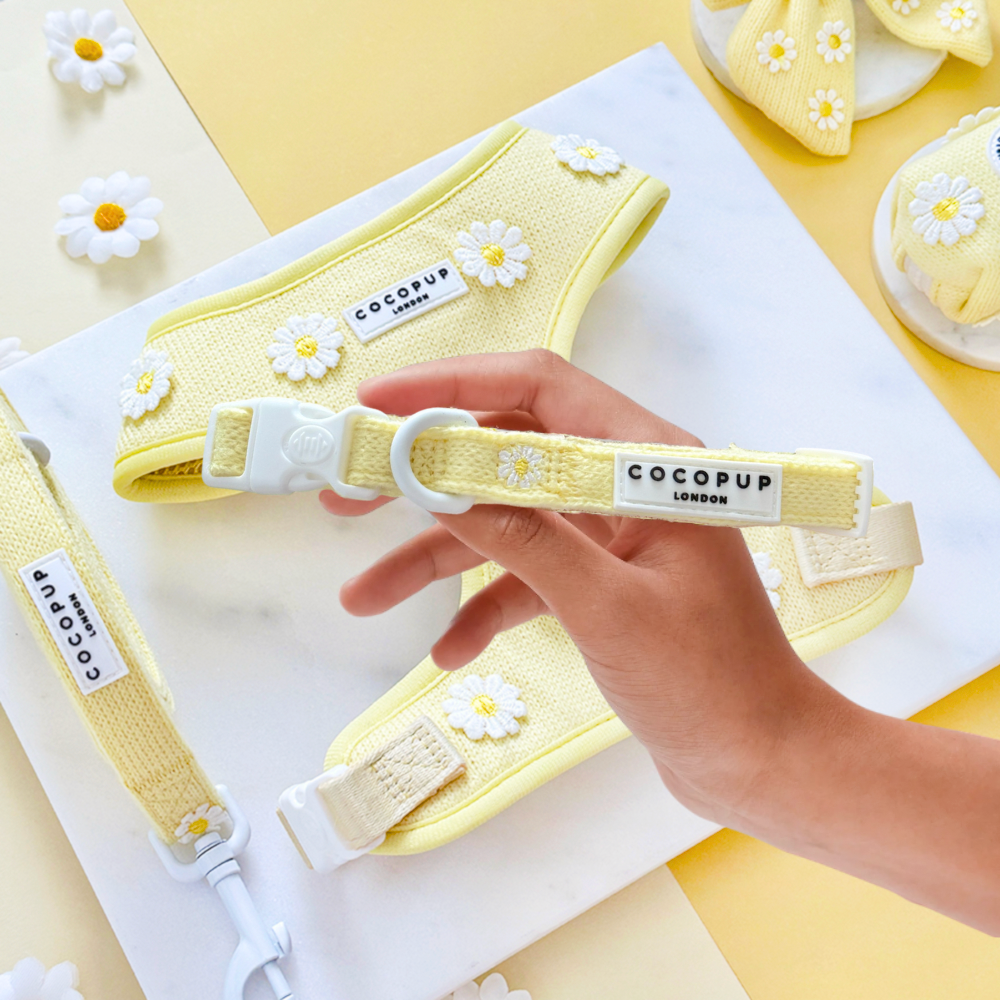 Introducing the Buttercup Pup Collar - perfect for your furry friend! This adorable buttery yellow Collar is adorned with delicate daisies, adding a touch of whimsy to your pup's wardrobe. Make a statement while keeping your dog safe and happy on walks.