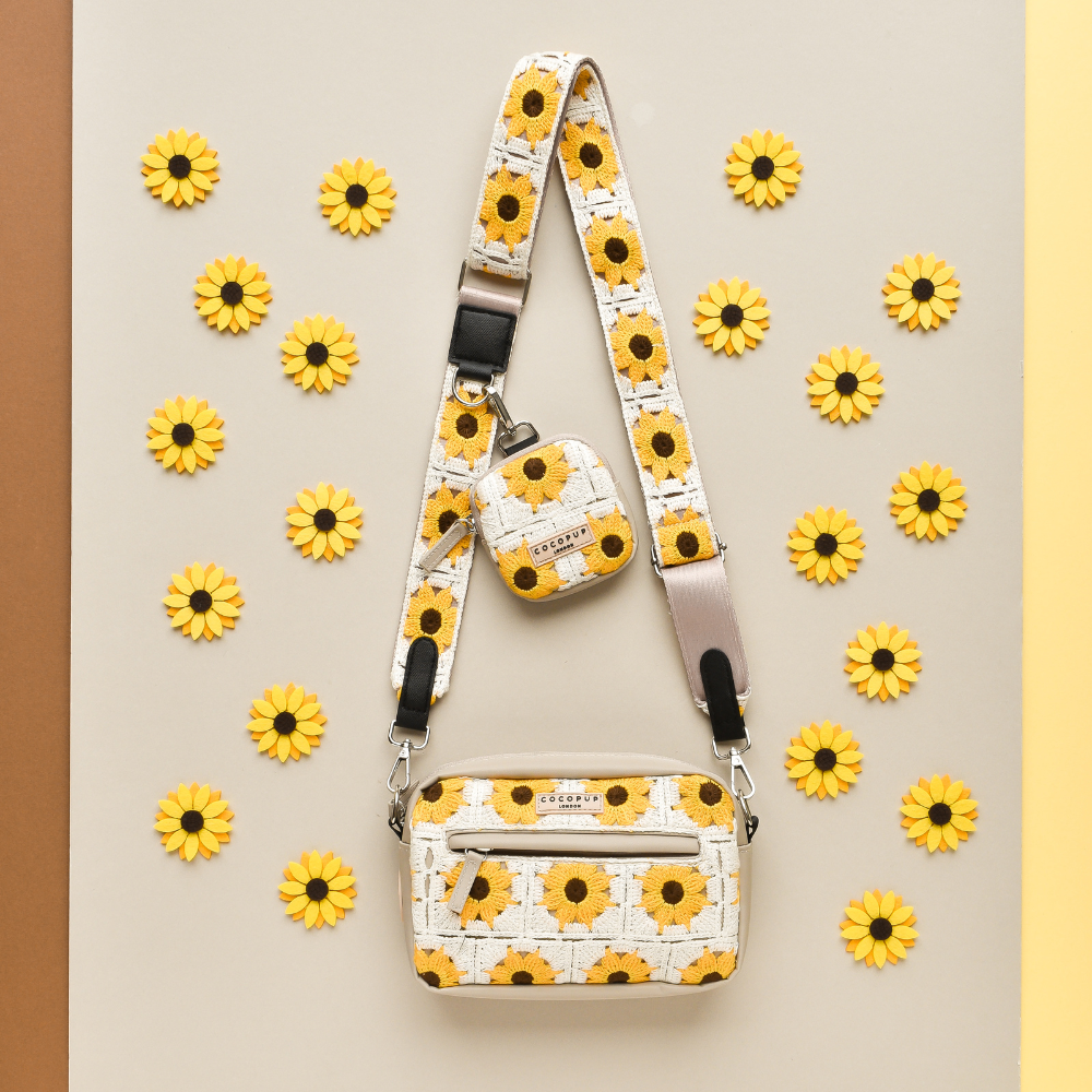 A cream-colored, crochet-style fabric camera strap with yellow sunflower patterns and a matching camera case is displayed on a light beige background. Several small yellow sunflower decorations are scattered around the strap and case, reminiscent of Cocopup London's Sunflower Patch Bag Strap.
