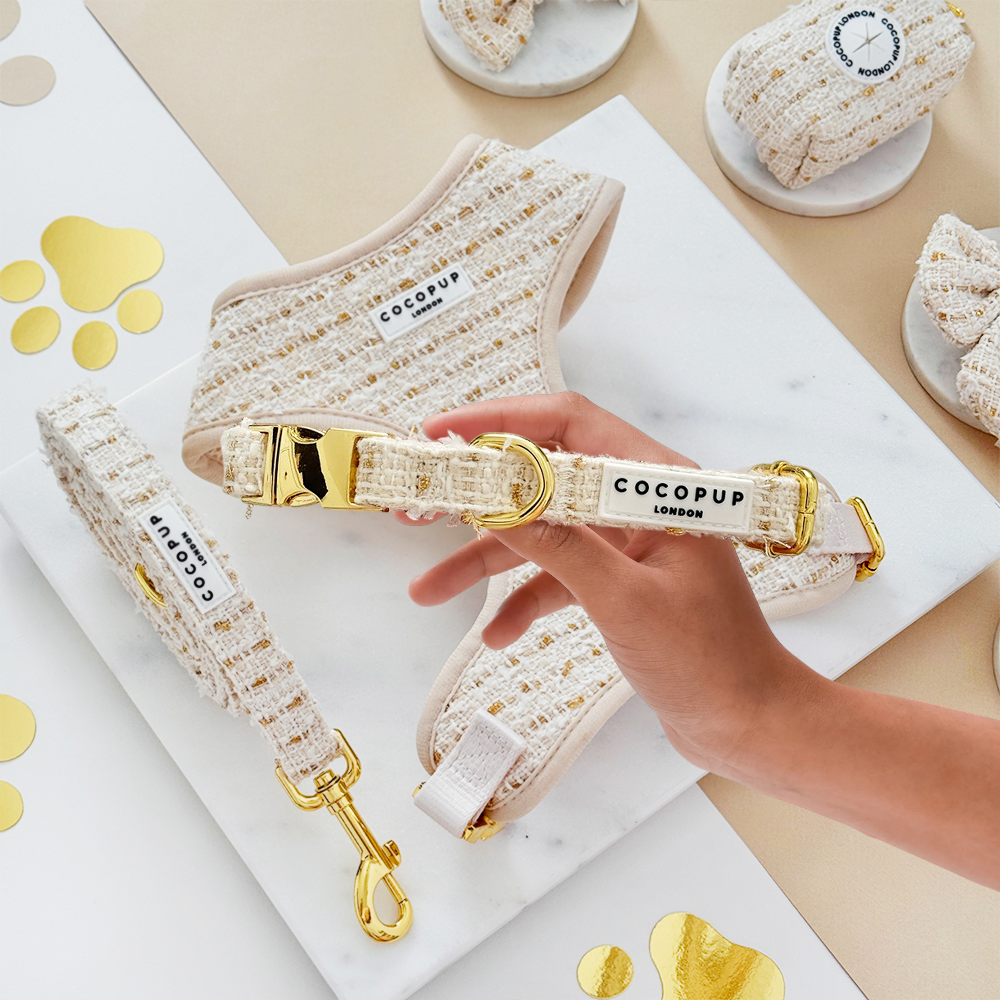 Walk your furry friend in style with our Vanilla Textured Tweed Collar! Made from chic textured tweed fabric, this cream-coloured collar will add a touch of elegance to any dog walk. Perfect for your fashion-forward pooch.